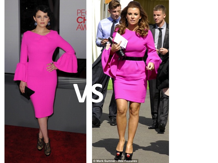But since it is Friday, let's play a game with the last of the pink dresses for the week - Colleen Rooney in Roksanda Ilincic that she belted in black for a trip to the races. Ginnifer Goodwin wore this dress about seven weeks ago and left off the belt and went lacy on the shoes. So, who do you think wore it best? Ginny vs Colleen for the winner of the pink dress. And go.